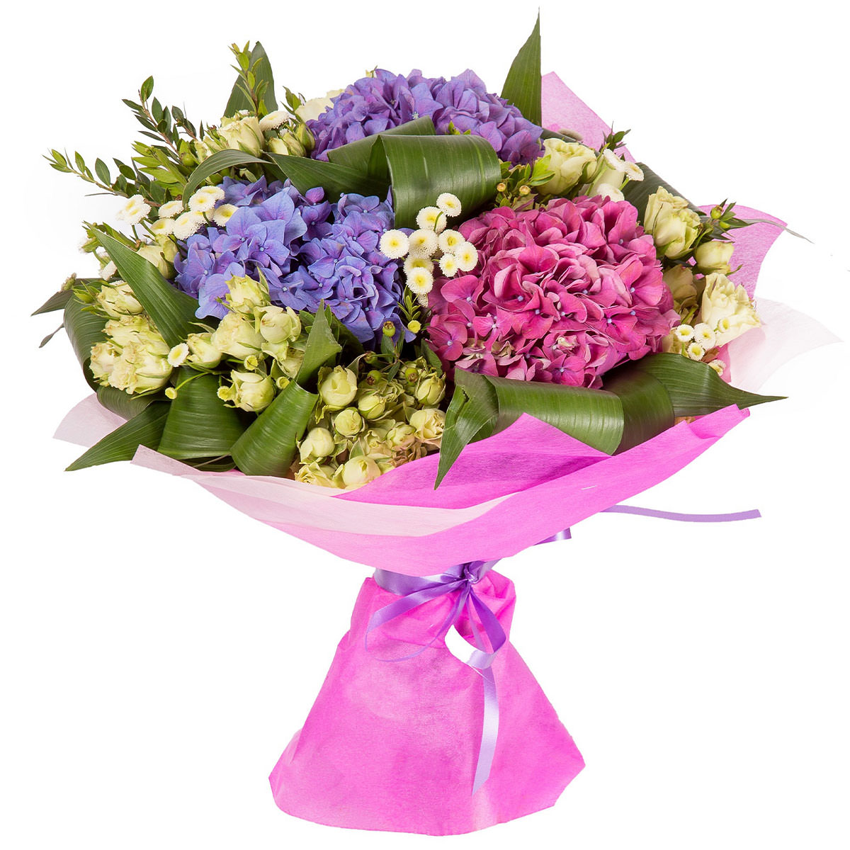 Яркие оттенки розового и фиолетового создают атмосферу радости и нежности. В составе букета розовая и фиолетовая гортензия, белая кустовая роза и миниатюрные маргаритки. Букет оформлен в розовую тканевую упаковку с элегантной лиловой лентой. Эта композиция создаёт атмосферу праздника и уюта, идеально подходя для вручения на юбилей для любимой женщины.