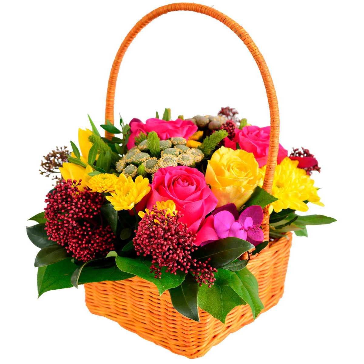 Эта радостная композиция сочетает в себе яркие розовые и жёлтые розы, жёлтые кустовые хризантемы, скимию и эвкалипт. Цветы расположены в плетёной корзине, придающей композиции уют и естественность. Такое оформление создаёт атмосферу тепла и радости. Идеально подойдёт для поздравления подруги на 8 Марта.