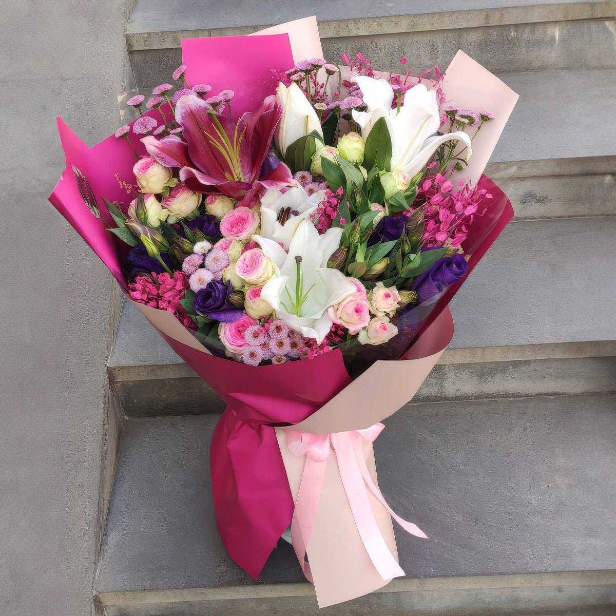 | Состав | Розы, Кустовые розы, Лилии, Пионовидные розы, Эустомы |