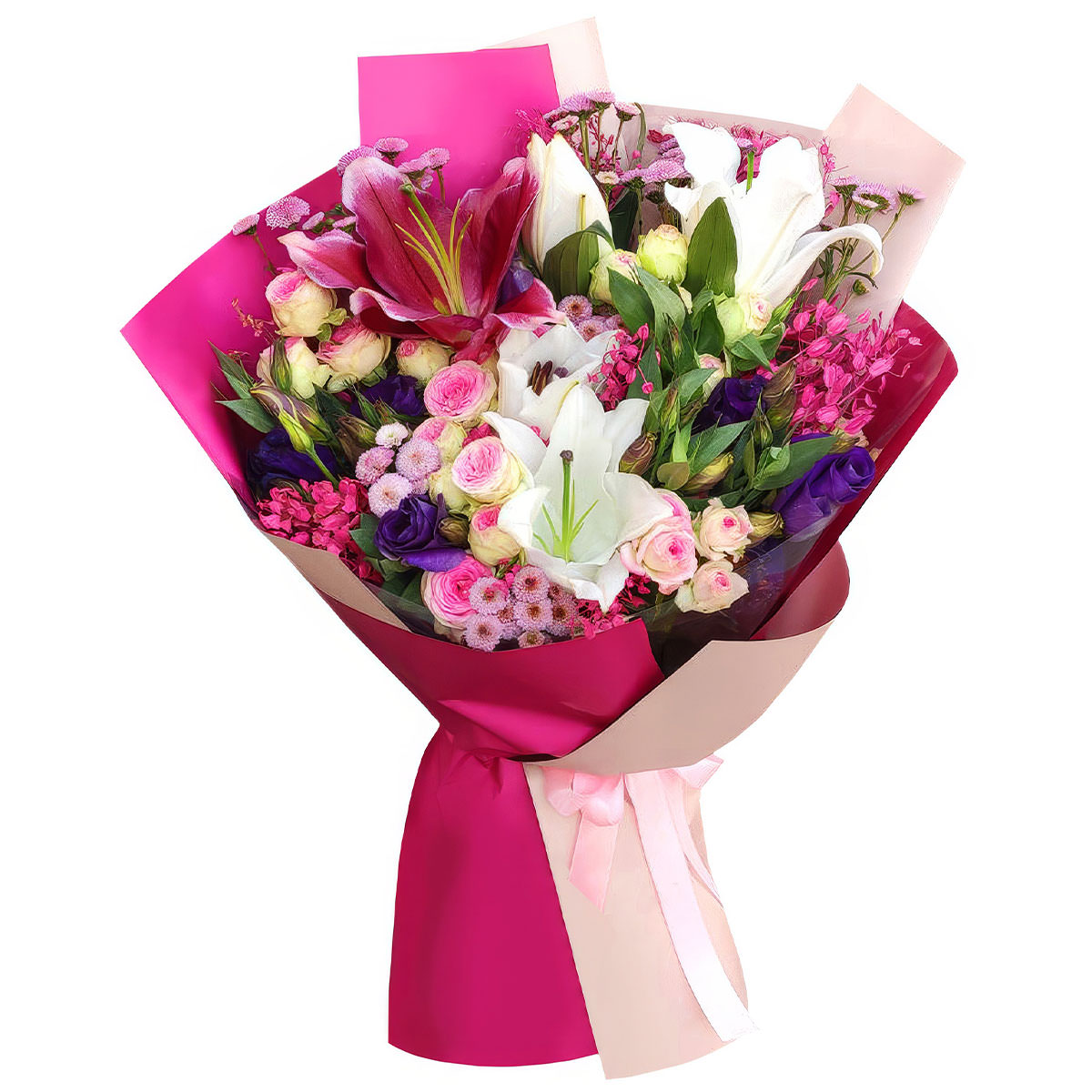 Яркие розовые и белые оттенки лилии и розовой кустовой розы создают атмосферу нежности и романтики. В составе букета белая и розовая лилия, розовая кустовая роза, розовая мини маргаритка, фиолетовая эустома и розовая лунария. Упакован в матовую пленку и обёрнут атласной лентой мягкого розового цвета. Этот букет создаёт атмосферу радости и подходит на свадьбу для молодой мамы.