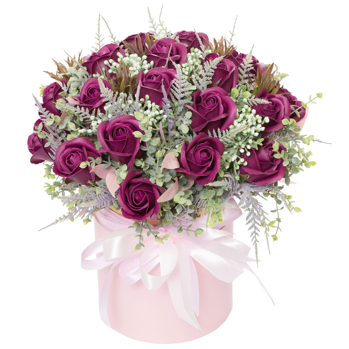 Эта композиция из насыщенных фиолетовых роз с добавлением нежной зелени создаёт атмосферу загадочности и элегантности. Розы, обрамлённые зеленью и декоративными элементами, расположены в шляпной коробке нежно-розового цвета, украшенной белой лентой. Такой букет идеально подойдет для романтического вечера для любимой женщины.