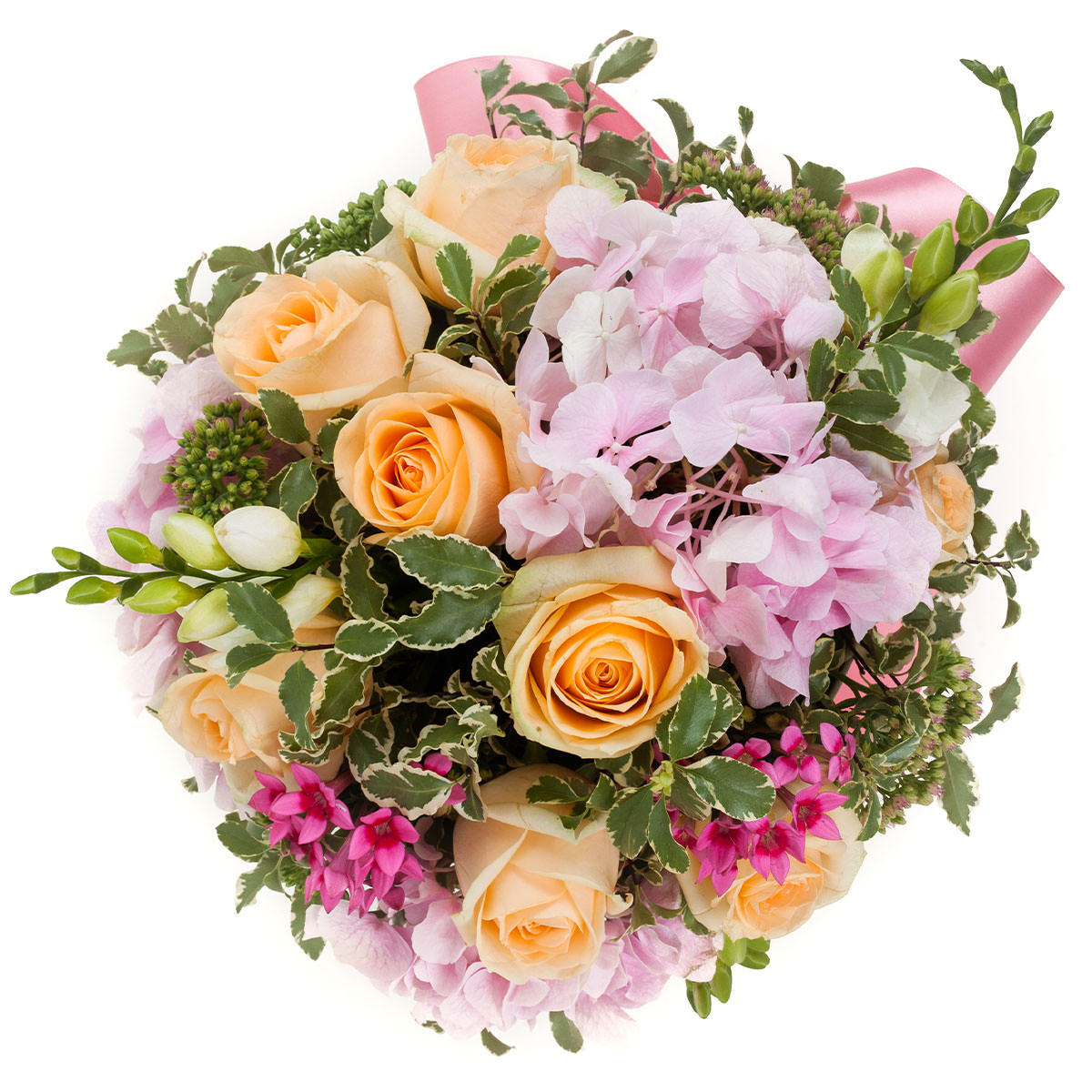 | Состав | Розы, Гортензии, Роза мисс пигги, Фрезии |