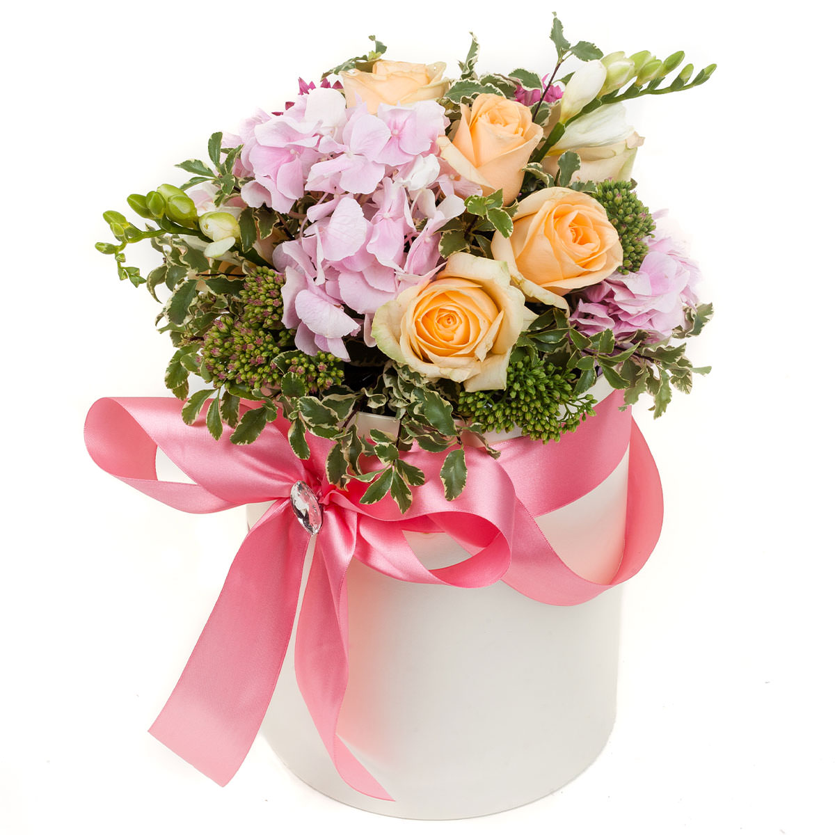 Эта композиция в пастельных тонах создаёт нежное и трогательное настроение. В составе розовая гортензия, персиковая одноголовая роза, белая фрезия и зелень. Букет оформлен в белую цилиндрическую шляпную коробку с яркой розовой атласной лентой. Прекрасный выбор для романтического вечера или для подарка любимой женщине.