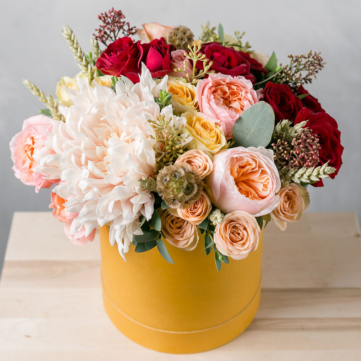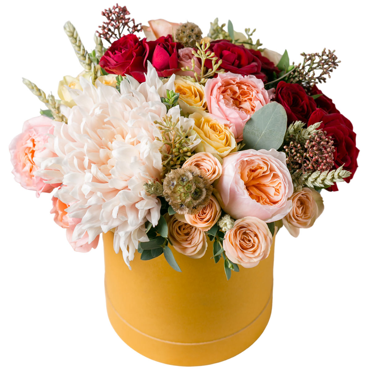 Тёплая палитра кремового пиона, персиковых пионовидных роз, красных одноголовых роз и жёлтых кустовых роз создаёт атмосферу уюта. В букете также присутствуют скабиоза и колос, добавляющие текстурную изюминку. Композиция размещена в элегантной жёлтой шляпной коробке, подчёркивающей естественную красоту цветов. Идеально подойдёт для поздравления любимой женщины на День матери.